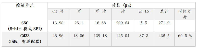 表2:SNC寫(xiě)/讀8 bit數(shù)據(jù)所需的時(shí)間以及CPU相應(yīng)所需的時(shí)間