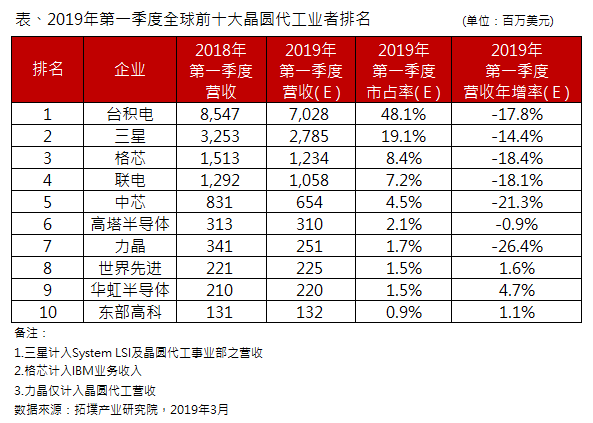 縱觀全球晶圓代工市場(chǎng),全球市場(chǎng)研究機(jī)構(gòu)TrendForce集邦咨詢旗下拓墣產(chǎn)業(yè)研究院報(bào)告統(tǒng)計(jì),2019年第一季度晶圓代工業(yè)者排名中,臺(tái)積電全球市占率48.1%、排名第一,格芯全球市占率8.4%、排名第三,聯(lián)電全球市占率7.2%、排名第四。
