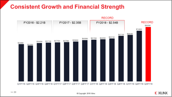 美國(guó)時(shí)間 2019 年 1 月 23 日,美國(guó)老牌芯片大廠 Xilinx 公布 2019財(cái)年第三季(截至2018年12月29日為止)財(cái)報(bào)單季營(yíng)收來到 8 億美元,這已是Xilinx連十三季營(yíng)收YoY成長(zhǎng),也讓 Xilinx股價(jià)站上每股 106 美元,回首 2016 年底以前,Xilinx 每股在 40、50 美元徘徊。截至今日,Xilinx股價(jià)已超過每股 130 美元。