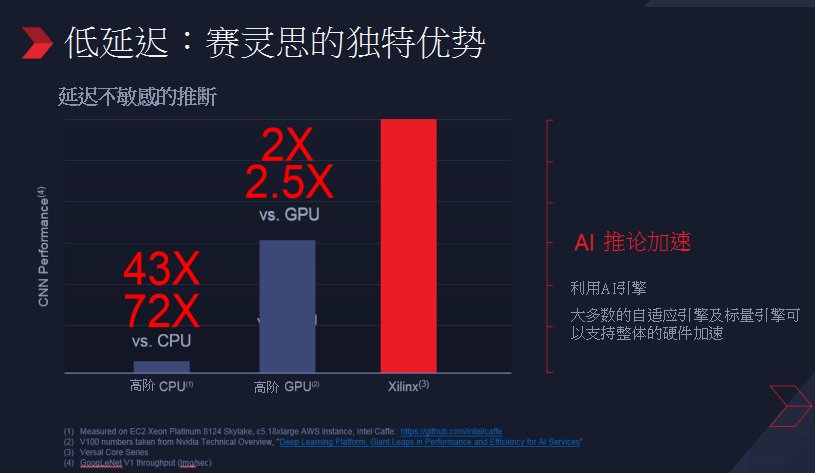 包含GPU、FPGA、ASIC、仿人腦芯片都是 AI 加速器的技術(shù)架構(gòu),GPU陣營(yíng)如 NVIDIA,F(xiàn)PGA陣營(yíng)則如Intel Altera與Xilinx。Intel Altera 與 Xilinx 在這近半年,其實(shí)都有揭露新產(chǎn)品的細(xì)節(jié),但以規(guī)格來看,Altera仍然沿用四核的Cortex-A53,相較于Xilinx ACAP(Adaptive Compute Acceleration Platform)系列的雙核A72設(shè)計(jì),再加上Xilinx在ACAP平臺(tái)又再加上AI與DSP引擎,對(duì)應(yīng)不同的工作負(fù)載,兩者相較之下,后者顯然有滿滿的誠(chéng)意。