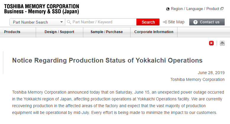 6月27日,西數(shù)發(fā)布新聞稿稱,6月15日,日本四日市地區(qū)意外停電,影響了其合資伙伴東芝閃存制造廠的生產(chǎn)運(yùn)營。西數(shù)表示,該停電事件影響了東芝設(shè)施和工藝工具,西數(shù)正在與東芝密切合作,以盡快將設(shè)施恢復(fù)到正常運(yùn)行狀態(tài)。