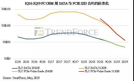 據(jù)集邦咨詢最新的調(diào)查顯示,2019年第二季主流容量PC-Client OEM SSD合約均價已連續(xù)六個季度下跌,其中SATA SSD合約均價較前一季下跌15-26%、PCIe SSD部分則下跌16-37%。原因包括NAND Flash市場持續(xù)嚴重供過于求,SSD領(lǐng)導廠商為求積極去化手中64/72層庫存大打價格戰(zhàn),以及Intel 3D QLC SSD帶來的比價效應(yīng)等。