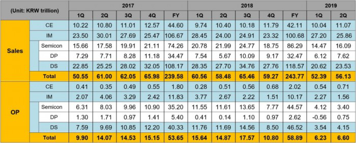 日前三星發(fā)布了該公司2019年第二季度財報。財報顯示,三星第二季度營收為56.1萬億韓元(約合475億美元),同比下滑4%;運營利潤為6.6萬億韓元(約合56億美元),同比下滑55.6%。