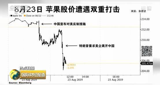 從蘋果公司8月23日股價走勢圖可以看出,在整個交易時段,有兩次斷崖式的暴跌:第一次暴跌是在中國宣布將對750億美元美國商品加征關(guān)稅后,第二次幅度更大的暴跌則是在特朗普發(fā)推要求所有美國企業(yè)離開中國后。