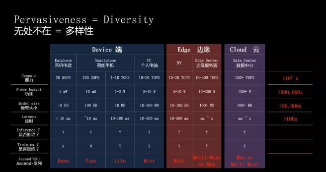 以Ascend芯片為例,Ascend-Nano可以用于耳機(jī)電話等IoT設(shè)備的使用場景;Ascend-Tiny和Ascend-Lite用于智能手機(jī)的AI運(yùn)算處理;在筆記本電腦等算力需求更高的便攜設(shè)備上,由Ascend-Mini提供算力支持;而邊緣側(cè)服務(wù)器上則需要由Multi-Ascend 310完成AI計(jì)算;至于超復(fù)雜的云端數(shù)據(jù)運(yùn)算處理,則交由算力最高可達(dá)256 TFLOPS@FP16的Ascend-Max來完成。