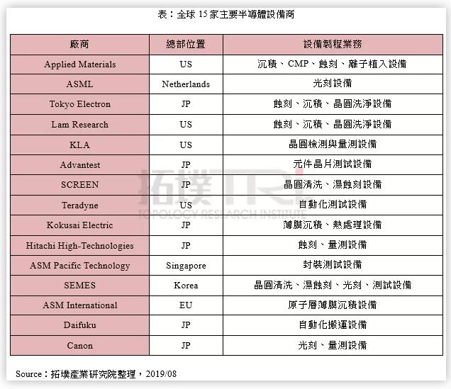 從全球半導(dǎo)體設(shè)備廠的總部位置來看,日本廠商占7間、美國廠商4間、歐洲廠商2間、新加坡與韓國各1間。由于美國與日本廠商為供應(yīng)鏈主要玩家,面對話題性不斷升溫的中美貿(mào)易戰(zhàn),以及近日突發(fā)的日韓貿(mào)易關(guān)系惡化,也讓半導(dǎo)體設(shè)備供需狀況,或?qū)⒊蔀槔^半導(dǎo)體材料后市場討論的議題。