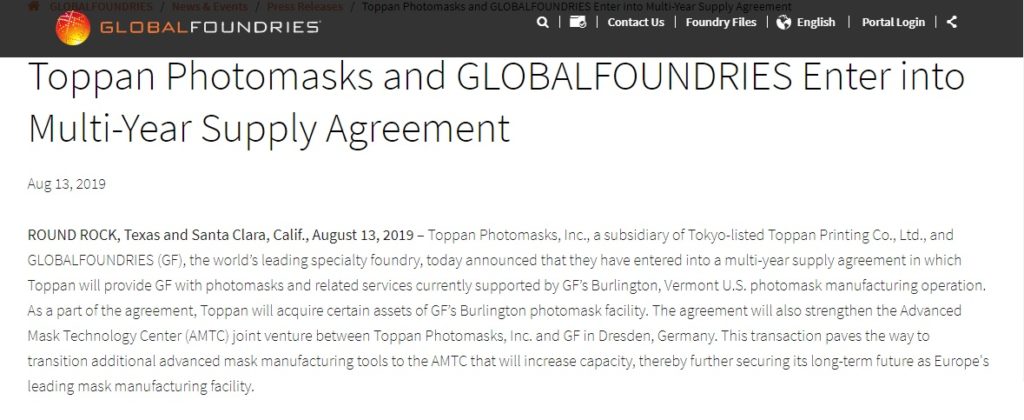 根據(jù)公布的資料顯示,在Toppan收購格芯位于美國佛蒙特州伯靈頓的光罩業(yè)務(wù)部分設(shè)備與資產(chǎn)之后,雙方也將透過簽屬一項多年的供應(yīng)協(xié)議,使Toppan將持續(xù)提供格芯目前所需要的光罩和相關(guān)服務(wù)。