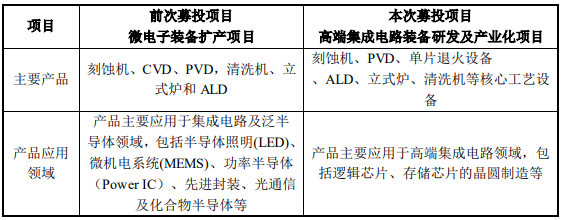 本次非公開(kāi)募投項(xiàng)目“高端集成電路裝備研發(fā)及產(chǎn)業(yè)化項(xiàng)目”和前次重組募投項(xiàng)目“微電子裝備擴(kuò)產(chǎn)項(xiàng)目”涉及產(chǎn)品的種類和應(yīng)用領(lǐng)域的差異如下所示: