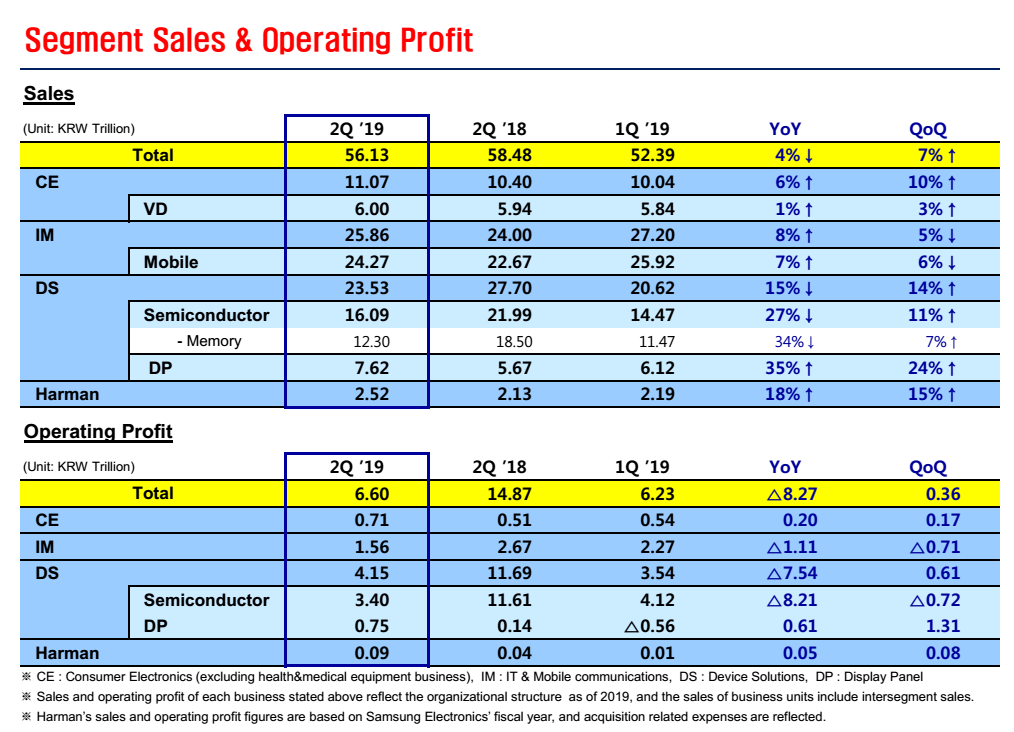 今日,三星電子公布了最新財報,數(shù)據(jù)顯示,三星電子第二季度營收為56.13萬億韓元(約合475億美元),同比下滑4%;運營利潤為6.6萬億韓元(約合56億美元),同比下滑55.6%,凈利潤5.18萬億韓元(約合44億美元),同比下滑53.1%。