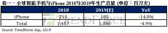 不過,在新品價(jià)格變得更有競(jìng)爭(zhēng)力后,今年iPhone的銷量恐怕難改頹勢(shì)。縱觀2019年全年,集邦咨詢預(yù)計(jì),2019年全球智能手機(jī)生產(chǎn)數(shù)量約13.86億支,年衰退4.9%,其中2019年iPhone生產(chǎn)數(shù)量約1.85億支,年衰退14.0%。