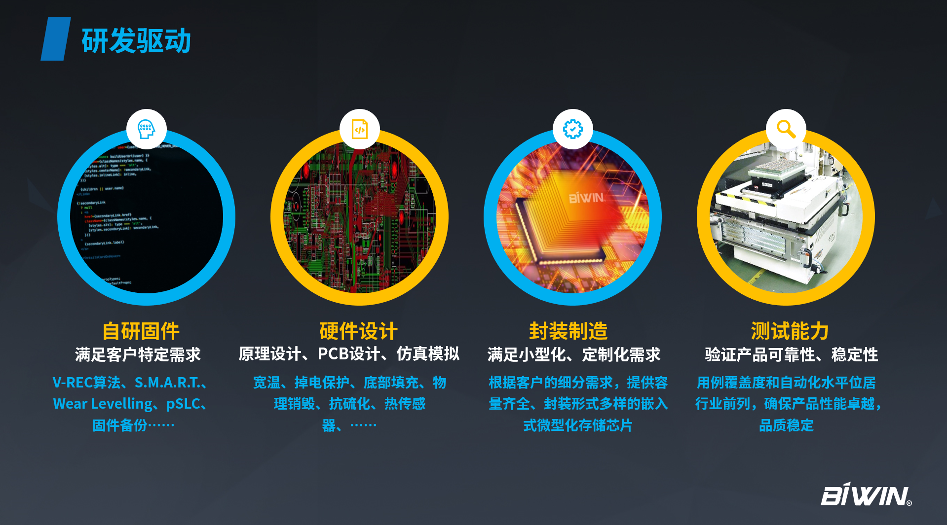 佰維專注于滿足“端”應(yīng)用需求,深耕存儲(chǔ)應(yīng)用24載,擁有業(yè)內(nèi)領(lǐng)先的存儲(chǔ)算法及固件開發(fā)能力、突出的硬件設(shè)計(jì)能力、全方位的測試能力以及以SiP為核心的先進(jìn)封裝制造能力,同時(shí)是業(yè)內(nèi)少數(shù)兼具芯片應(yīng)用設(shè)計(jì)與封測制造能力的存儲(chǔ)企業(yè)。