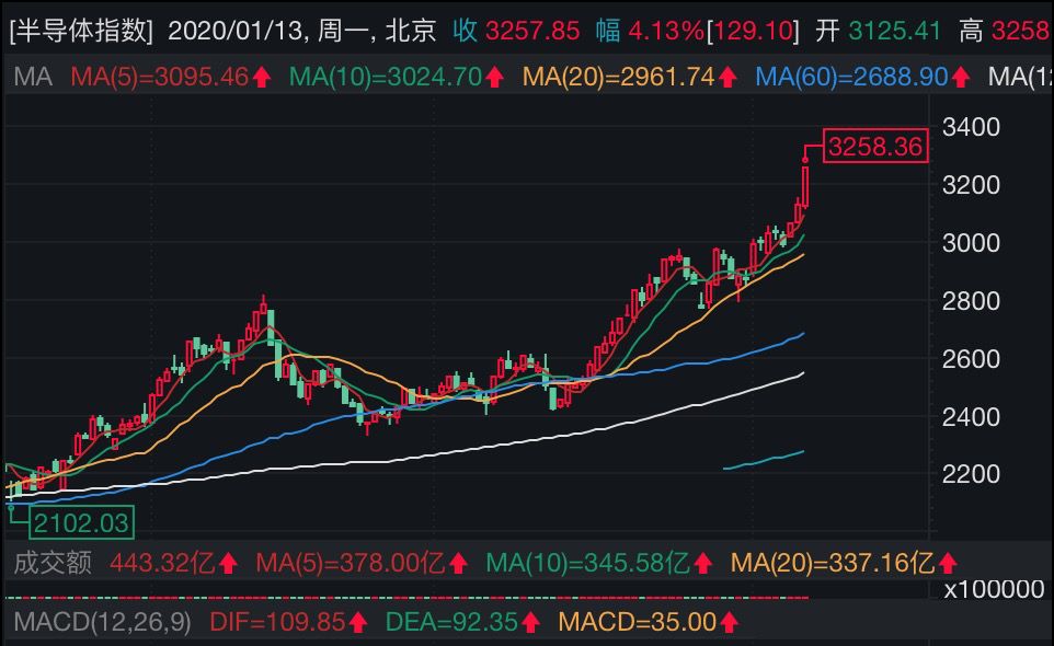 這已經(jīng)是半導體板塊連續(xù)三個交易日大漲。從2019年11月26日至2020年1月13日的34個交易日內,該板塊累計漲逾34%。與此同時,港股市場、美股市場的半導體股亦表現(xiàn)出色。
