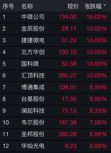 截至收盤,中微公司(科創(chuàng)板)上漲16.02%,板塊內還有5只個股漲停,分別為金辰股份、捷捷微電、北方華創(chuàng)、國科微、匯頂科技。博通集成、臺基股份、瀾起科技均漲逾8%。