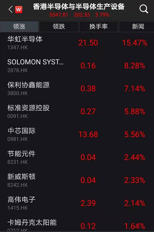 截至13日收盤,港股市場半導體與半導體生產設備板塊大漲3.79%,漲幅居Wind行業(yè)板塊首位。其中,華虹半導體漲逾15%。