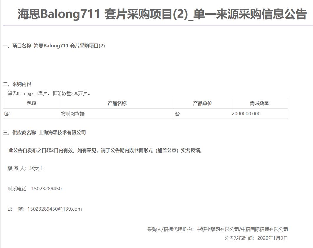 近日,中國移動采購與招標網(wǎng)公告顯示,中移物聯(lián)網(wǎng)有限公司向華為旗下上海海思技術有限公司采購海思Balong 711套片,框架數(shù)量200萬片。