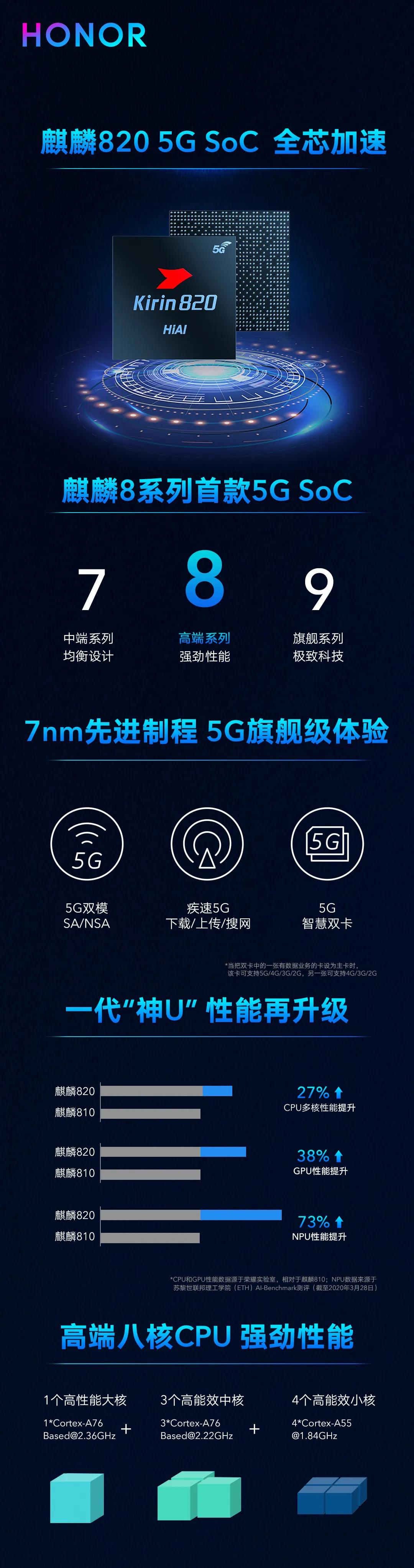 半導體聯(lián)盟消息,近日榮耀舉行線上新品發(fā)布會,華為8系列全新5G SoC麒麟820搭載于榮耀30S首次亮相。相比上一代麒麟810,麒麟820的性能、能效、AI及拍照能力全面提升,實現(xiàn)手機體驗的全方位升級。