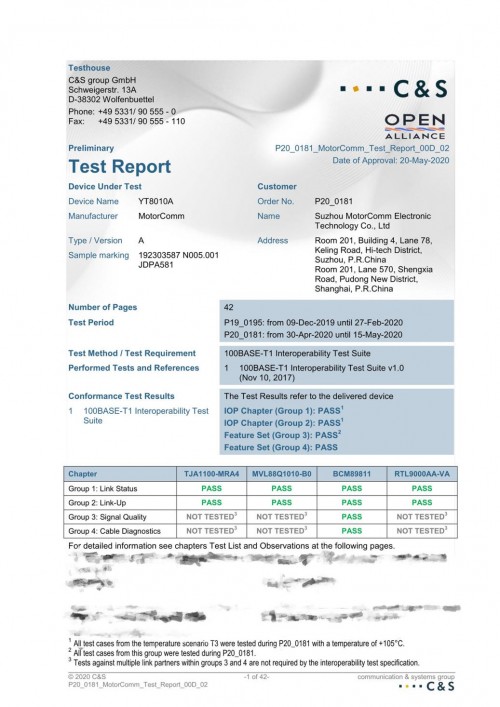 在業(yè)內(nèi),絕大多數(shù)人都知道,只要拿到了AEC Q-100/200認(rèn)證,就算是拿到了進(jìn)入汽車行業(yè)的入門證,但是在車載通信領(lǐng)域,滿足AEC Q-100/200認(rèn)證還不夠,車載以太網(wǎng)芯片還需要滿足國際上對于互聯(lián)互通兼容性的強(qiáng)制認(rèn)證。目前有資質(zhì)做C&S測試的專業(yè)認(rèn)證機(jī)構(gòu)非常少,裕太車通立足于國際化要求,選擇了國際公認(rèn)的- 德國C&S互聯(lián)互通實驗室 - 進(jìn)行互聯(lián)互通兼容性測試。
