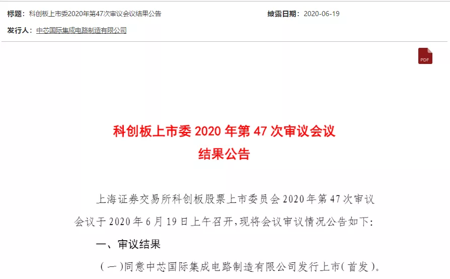 半導(dǎo)體聯(lián)盟消息,2020年6月19日,上海證券交易所官網(wǎng)發(fā)布的《科創(chuàng)板上市委2020年第47次審議會(huì)議結(jié)果公告》顯示,科創(chuàng)板上市委員會(huì)同意中芯國(guó)際發(fā)行上市(首發(fā))。