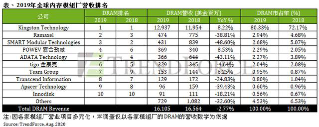 值得一提的是,根據(jù)TrendForce集邦咨詢最新發(fā)布的“2019年全球內(nèi)存模組廠營(yíng)收排名”,嘉合勁威上升成為“2019年全球內(nèi)存模組廠營(yíng)收排名”榜單第4名。