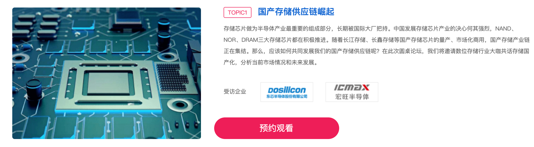 本次展會將在館內(nèi)建立直播間,圍繞“國產(chǎn)存儲供應(yīng)鏈崛起”和“國產(chǎn)MCU如何抓住潛力市場,提升市場占有率?”為主要話題,邀請行業(yè)領(lǐng)軍人物接受視頻采訪,為大家分享產(chǎn)業(yè)新動向、產(chǎn)品新技術(shù)、創(chuàng)新解決方案等。