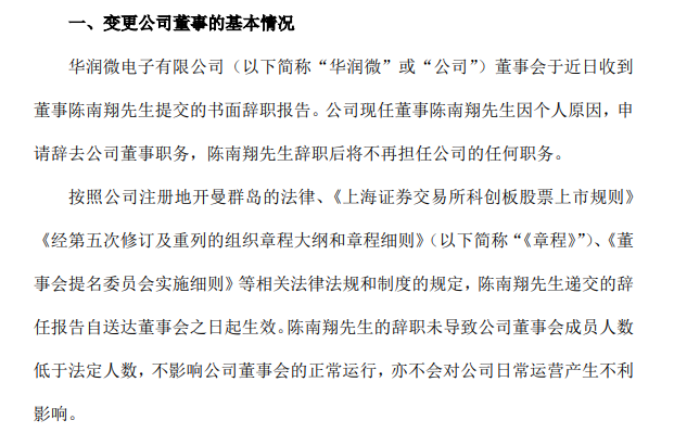 根據(jù)董事變更公告,華潤微董事會于近日收到董事陳南翔先生提交的書面辭職報告,公司現(xiàn)任董事陳南翔先生因個人原因,申請辭去公司董事職務(wù),辭職后,陳南翔將不再擔(dān)任華潤微的任何職務(wù),其董事職務(wù)由李虹先生擔(dān)任