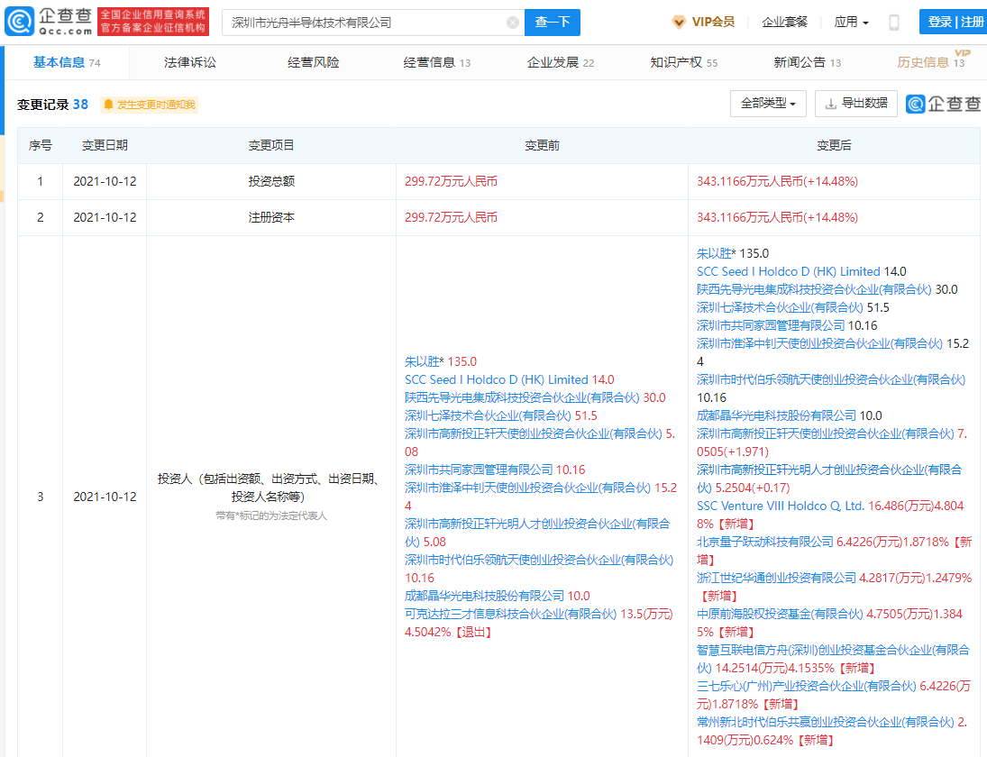 同時(shí),光舟半導(dǎo)體的注冊(cè)資本由299.72萬(wàn)元人民幣增加至343.12萬(wàn)元人民幣,增幅為14.48%。