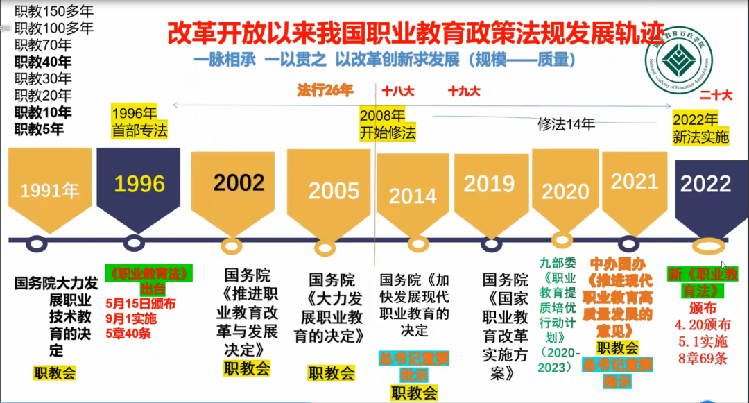 國家教育行政學院學術(shù)委員會主任邢暉介紹了職業(yè)教育新法、新政、新策略,表示推進職業(yè)教育改革,需提高職業(yè)教育質(zhì)量,增強職業(yè)教育適應性,建立健全適應社會主義市場經(jīng)濟和社會發(fā)展需要、符合技術(shù)技能人才成長規(guī)律的職業(yè)教育制度體系。