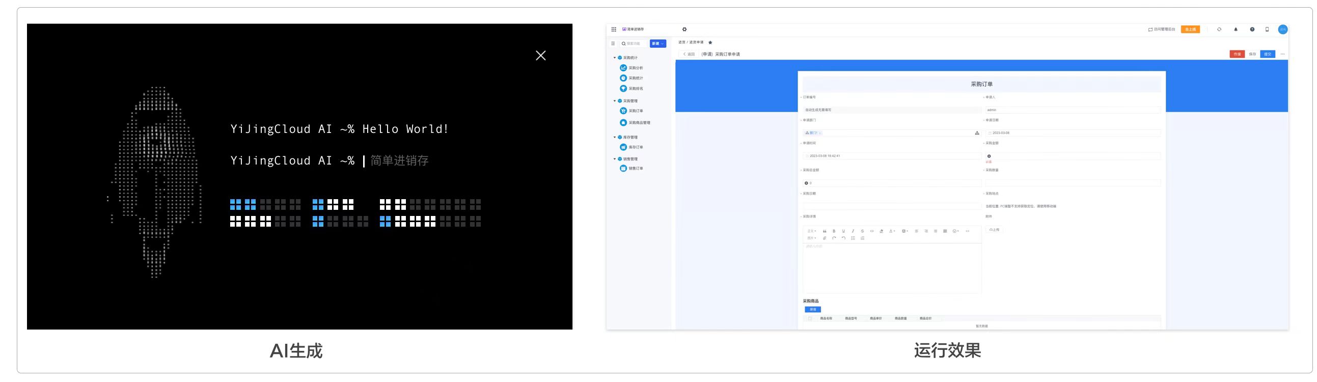 以「易鯨云」低/無代碼平臺(tái)為例,在測試階段基于AIGC模式,當(dāng)用戶輸入想要的應(yīng)用名稱(如進(jìn)銷存),平臺(tái)通過用戶信賴的AI產(chǎn)品推理出與進(jìn)銷存相關(guān)的內(nèi)容,自動(dòng)組裝一個(gè)完整應(yīng)用,當(dāng)未滿足AIGC生成應(yīng)用情況下,可通過拖拉拽方式,滿足用戶個(gè)性化需求,持續(xù)迭代。