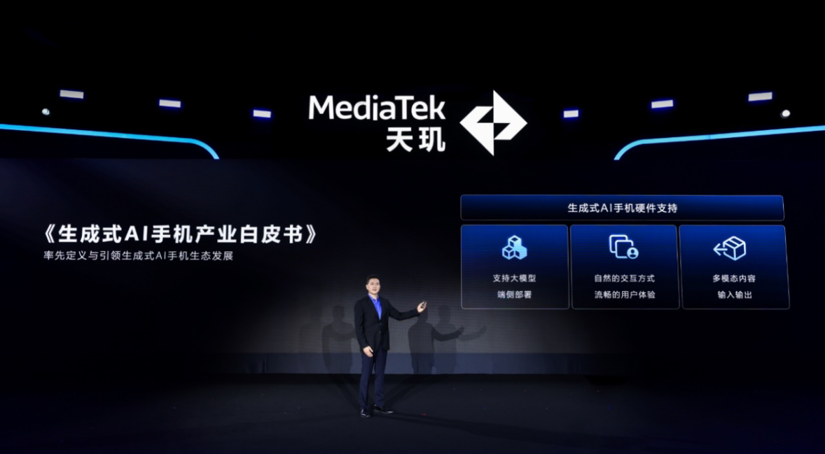 在天璣開發(fā)者大會上,聯(lián)發(fā)科聯(lián)合Counterpoint并攜手阿里云通義千問、百川大模型、虎牙、酷狗音樂、零一萬物、OPPO、Soul、騰訊AI Lab、騰訊混元、vivo行業(yè)頭部伙伴聯(lián)合發(fā)布《生成式AI手機(jī)產(chǎn)業(yè)白皮書》,共同定義了“生成式AI手機(jī)”的概念和典型特征?!栋灼诽岬剑荷墒紸I手機(jī)是利用大規(guī)模、預(yù)訓(xùn)練的生成式AI模型,實(shí)現(xiàn)多模態(tài)內(nèi)容生成、情境感知,并具備不斷增強(qiáng)的類人能力。生成式AI手機(jī)開啟了智能手機(jī)發(fā)展的新周期,長遠(yuǎn)看,智能手機(jī)將會發(fā)展為移動智能體。