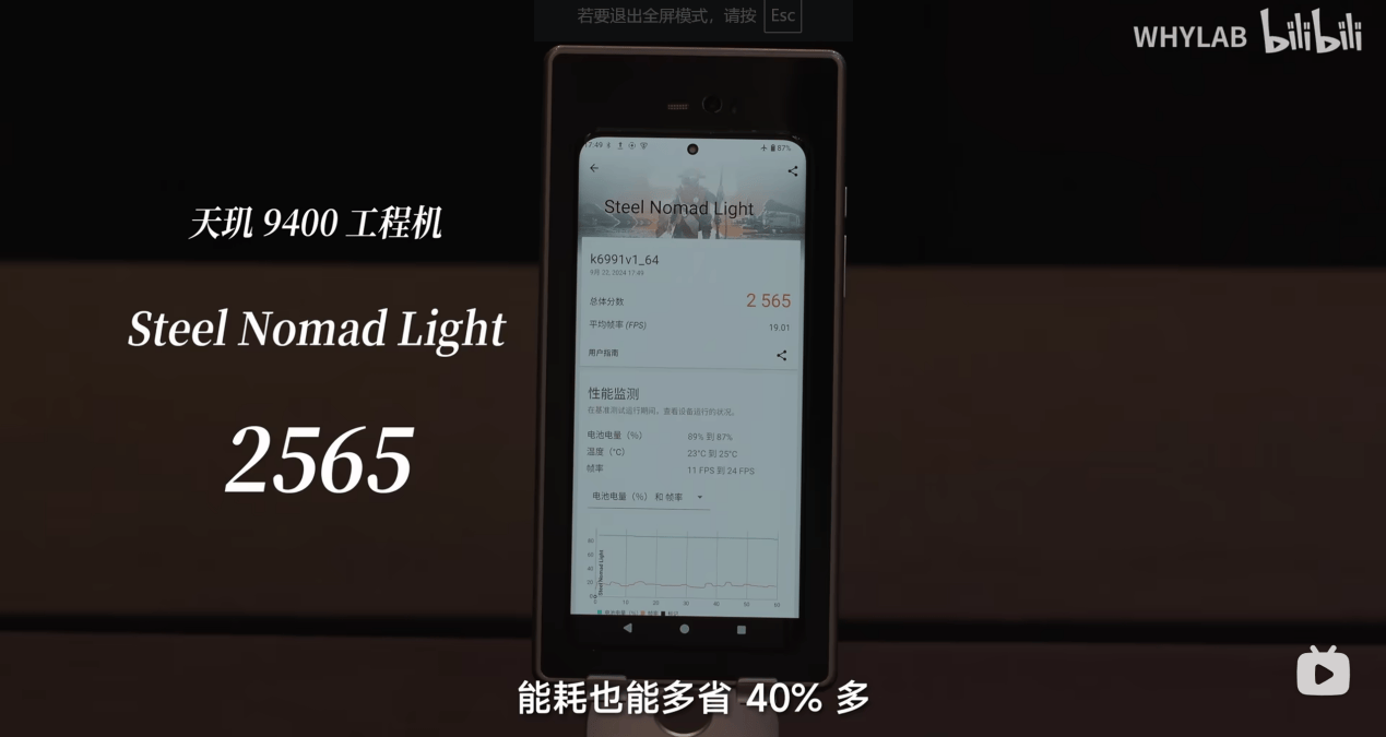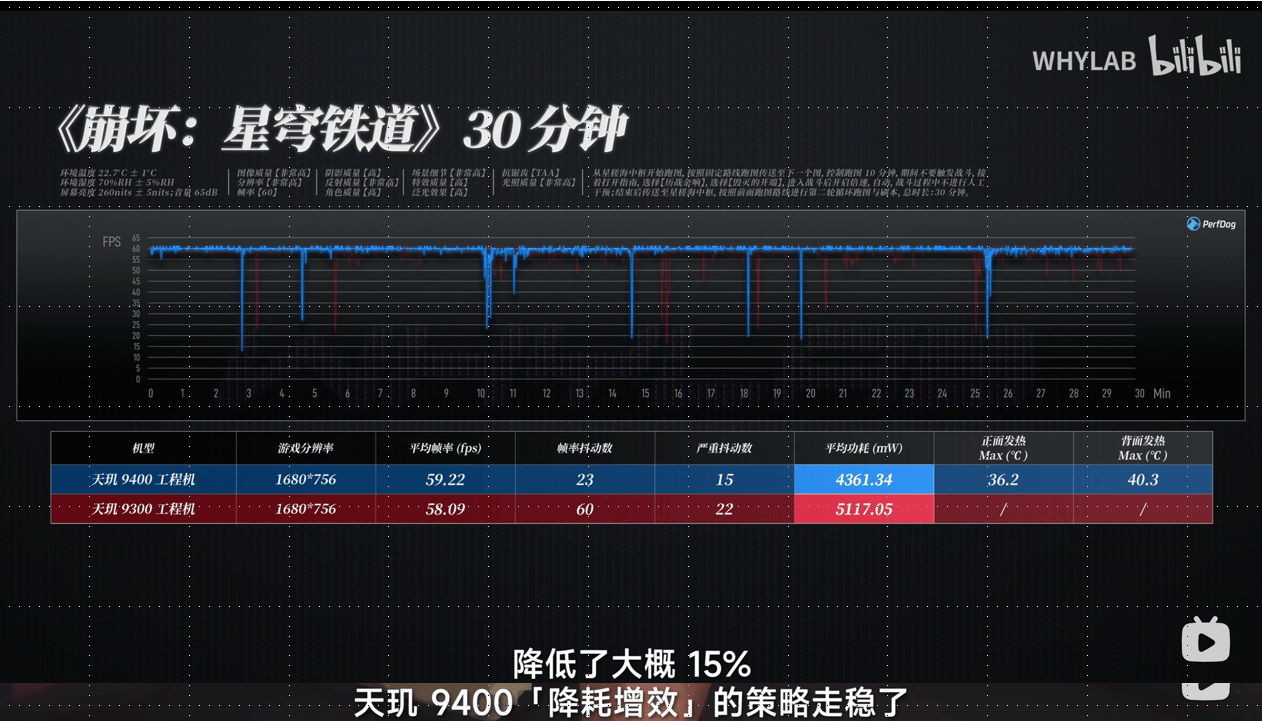 《崩壞:星穹鐵道》同樣測試半小時(shí),除了轉(zhuǎn)場時(shí)無法避免的降幀波谷,天璣9400的幀率曲線明顯拉得更平直,對(duì)比天璣9300,幀率更滿了,抖動(dòng)也少了。關(guān)鍵是功耗降低了大概15%,背面溫度最高也就40.3℃。能初步判定天璣9400降耗增效的策略走穩(wěn)了。