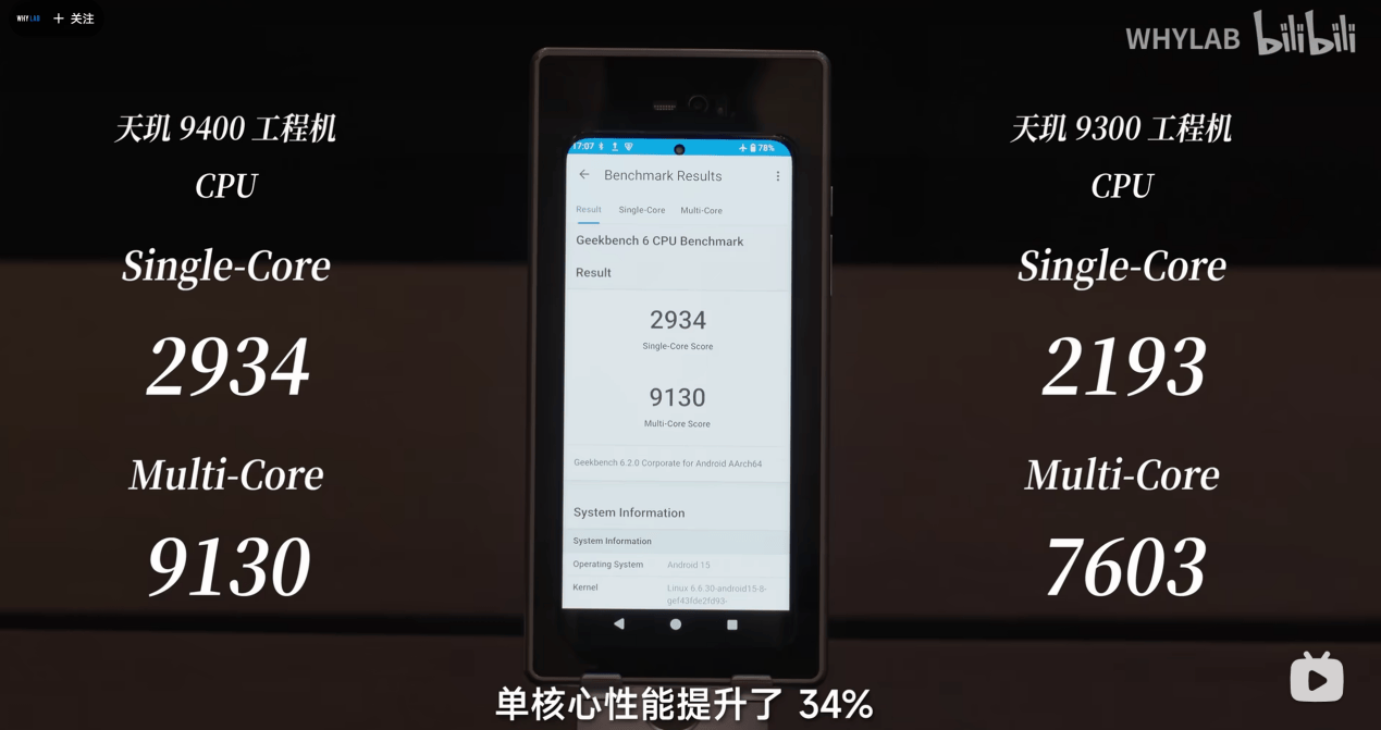 首先來看天璣9400采用的第二代全大核架構(gòu)CPU。在WHYLAB Geekbench 6測試中,天璣9400單核心成績達(dá)到2900以上,多核心成績更是突破了9100分。對(duì)比天璣9300,不論是單核還是多核都提升巨大。再加上發(fā)布會(huì)上公布的,天璣9400 CPU多核功耗有40%的節(jié)省幅度,這個(gè)收益還是挺可觀的。