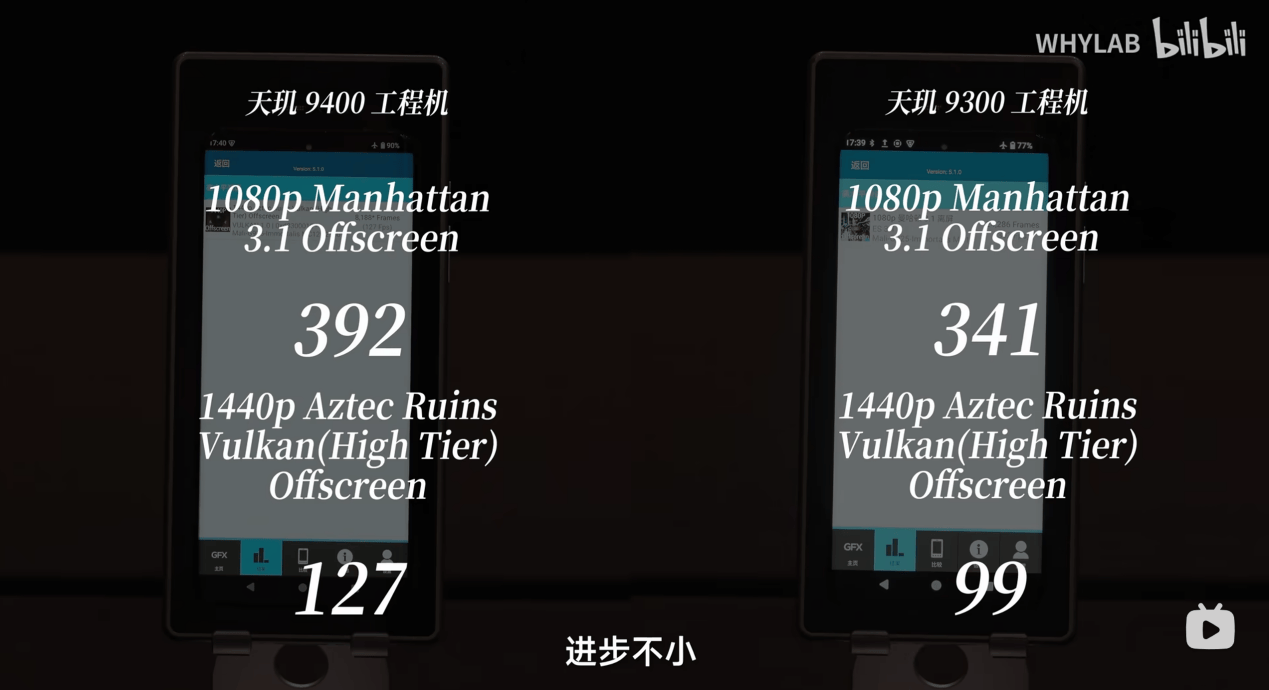 再來看WHYLAB對(duì)于天璣9400的GPU和游戲測試成績。對(duì)比天璣9300,從1080P曼哈頓(3.1)和1440p Aztec(Vulkan)的離屏渲染幀數(shù)來看,天璣9400的進(jìn)步很大。