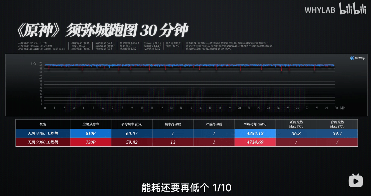 GPU強(qiáng)悍的性能對(duì)于體驗(yàn)最直觀的提升,還是要看游戲測試。用WHYLAB統(tǒng)一的實(shí)驗(yàn)室游戲設(shè)置和測試路線,在810P的渲染分辨率下,測試了半小時(shí)的《原神》須彌城。測試成績平均幀率60.07幀,輸出意料中地好又穩(wěn)。關(guān)鍵看功耗,平均4.3W,比天璣9300在720畫質(zhì)下,能效還能低1/10。