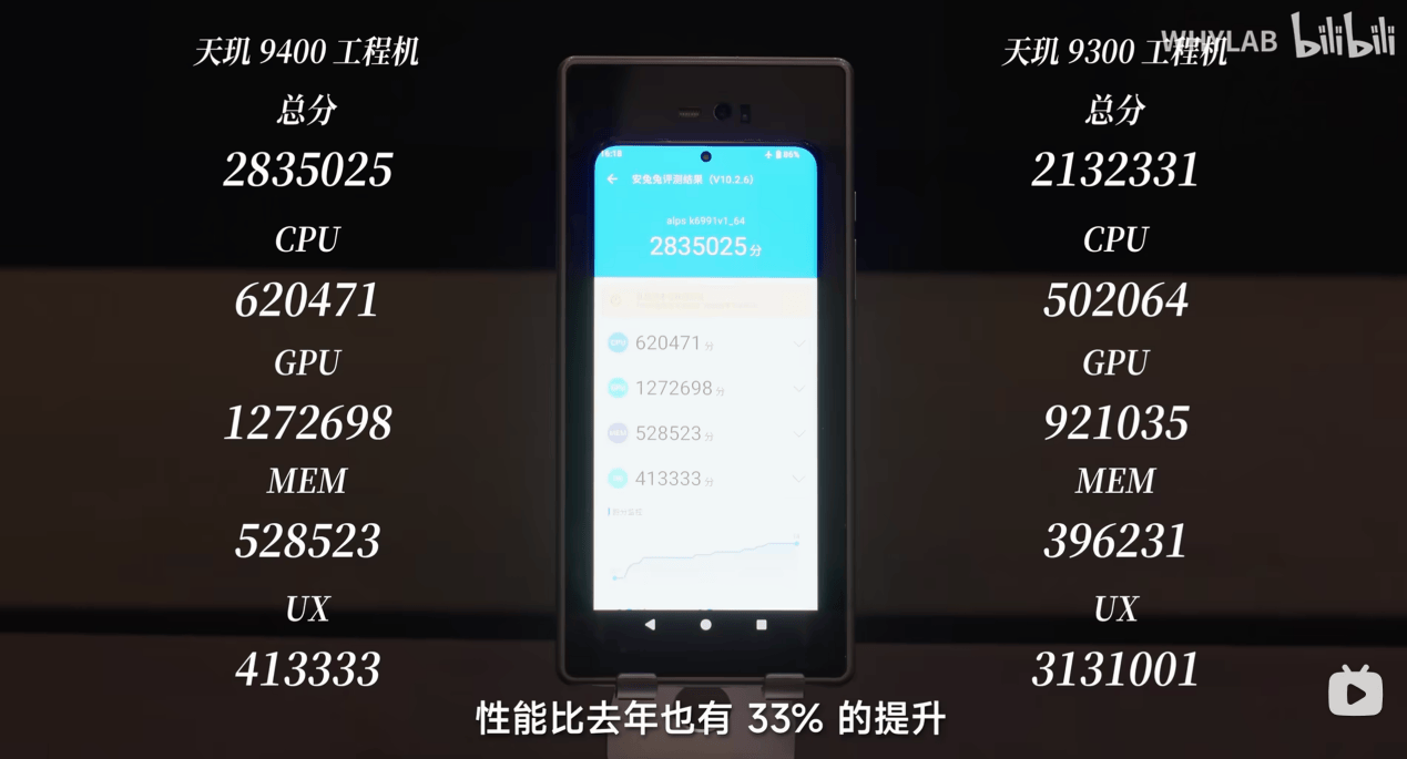 在WHYLAB的安兔兔跑分測試中,天璣9400總分283萬分,性能對(duì)比去年旗艦有33%的提升,順利登頂旗艦芯性能第一。