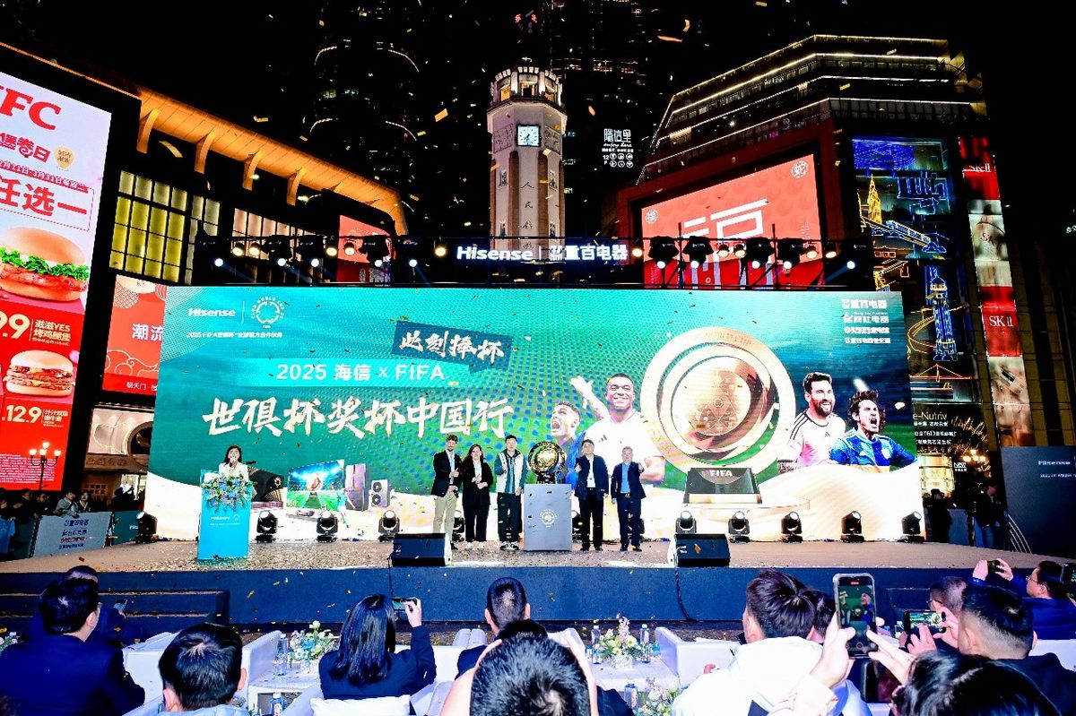 在海信、重慶百貨、FIFA官員及孫繼海等嘉賓的見證下,2025世俱杯獎(jiǎng)杯登上了解放碑舞臺(tái),F(xiàn)IFA官方解鎖獎(jiǎng)杯,臺(tái)上嘉賓共同完成“捧杯”儀式。2025海信XFIFA世俱杯獎(jiǎng)杯中國(guó)行是世俱杯獎(jiǎng)杯首次亮相中國(guó),重慶作為本次活動(dòng)的唯一一站,解放碑前的“捧杯時(shí)刻”無疑定格了歷史性一刻。