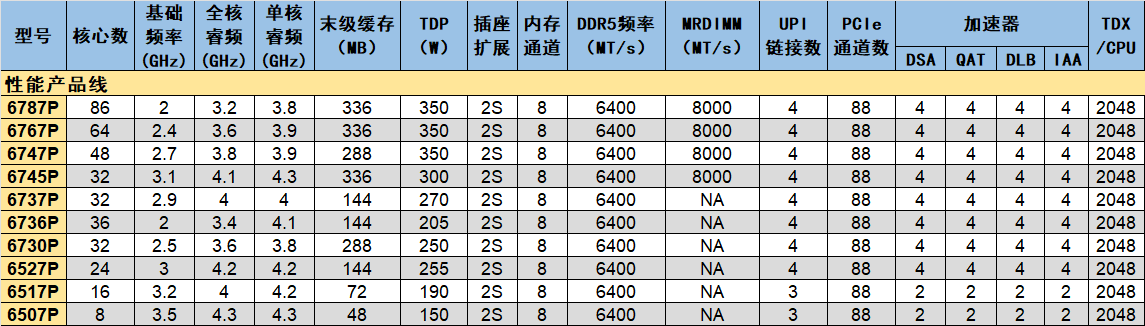 高性能產(chǎn)品線提供了最多86核的型號(6787P),多數(shù)型號的加速器全部打開。至強6的每個IO單元提供2個加速器模塊,每個模塊有DSA、QAT、DLB、IAA各1。兩個IO單元就是4種加速器各4個。基于LCC的6517P 和 6507P提供的加速器是各兩個。