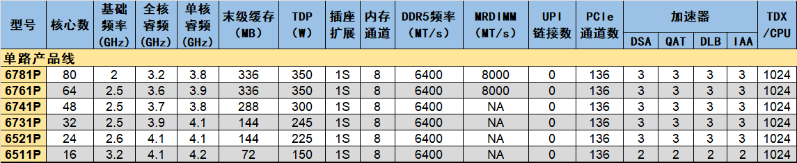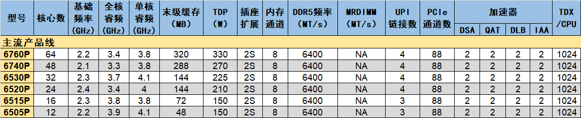 主流產(chǎn)品線的核數(shù)跨度在12個到64個之間,顯然也使用了三種版本的內(nèi)核封裝。其中兩款67x0P使用XCC,卻沒有開放MRDIMM的支持。不過好在二者的末級緩存都較大,平均每核心的緩存容量達到至少5MB。相比高性能產(chǎn)品線,主流產(chǎn)品線的加速器只開放了一半,分別只有2個,每CPU的TDX數(shù)量也減半了。