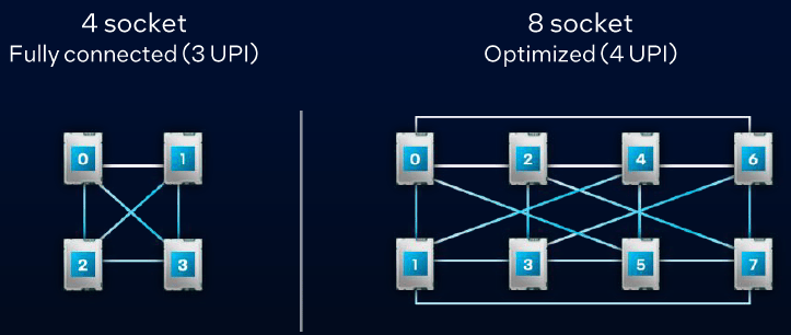 多路產(chǎn)品線是為4路、8路服務器準備的,售價較高,均被列入67xxP序列。該產(chǎn)品線的型號也比較容易理解,第三位數(shù)字大致對應了核數(shù)多寡;第四位數(shù)字是8或4,清晰體現(xiàn)了其原生的UPI直連多路支持能力。譬如6724P和6714P基于LCC,每個插槽有3個UPI鏈接,正好可以分別直連其他3個插座以構成全連接的4路系統(tǒng),或通過節(jié)點控制器實現(xiàn)8路。其余尾數(shù)為8的處理器都有4個UPI,可以構成典型的8路系統(tǒng)。